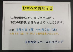 本日のファーストリビングNewsは 4月の社内研修に伴うお休みについてお知らせがございます(^……
