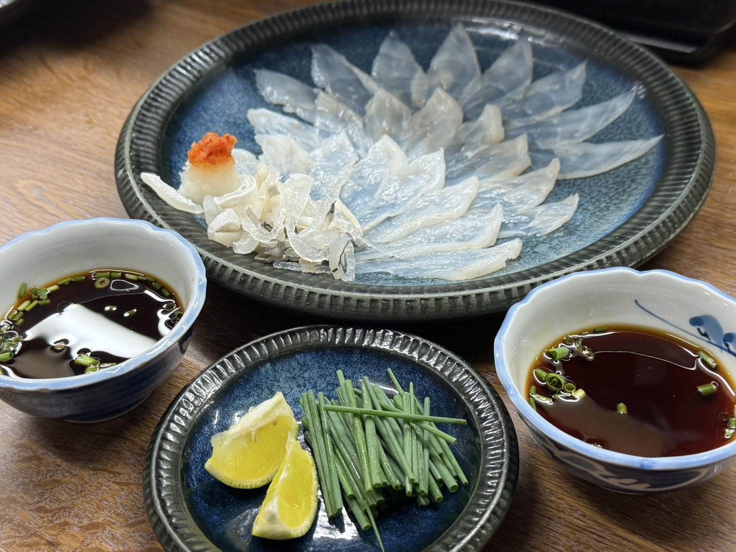 まずは定番の**ふぐ刺し(てっさ)**をいただきました。