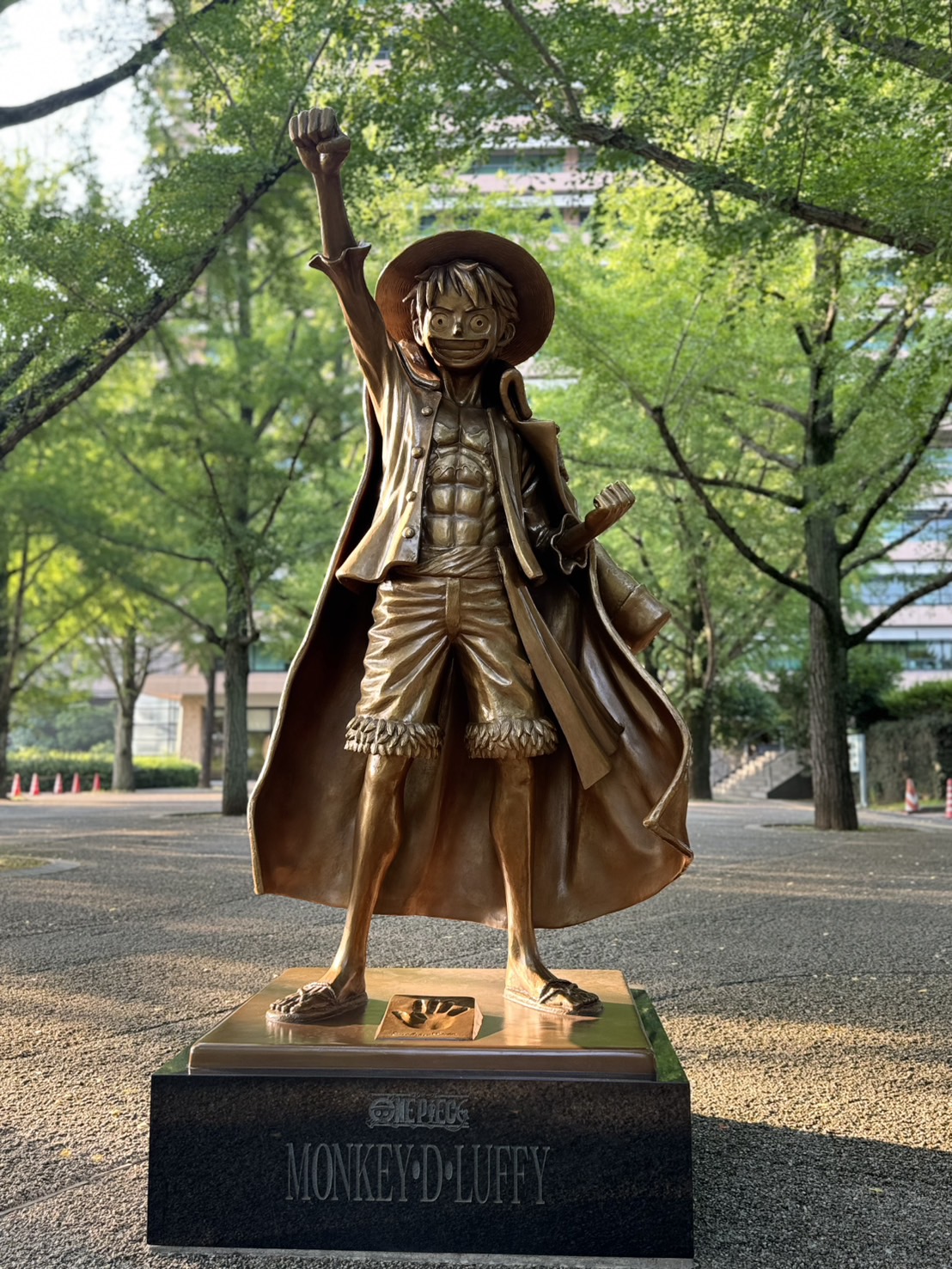 このルフィ像は、熊本地震からの復興を願って設置されたもので、熊本県庁プロムナードにあります。