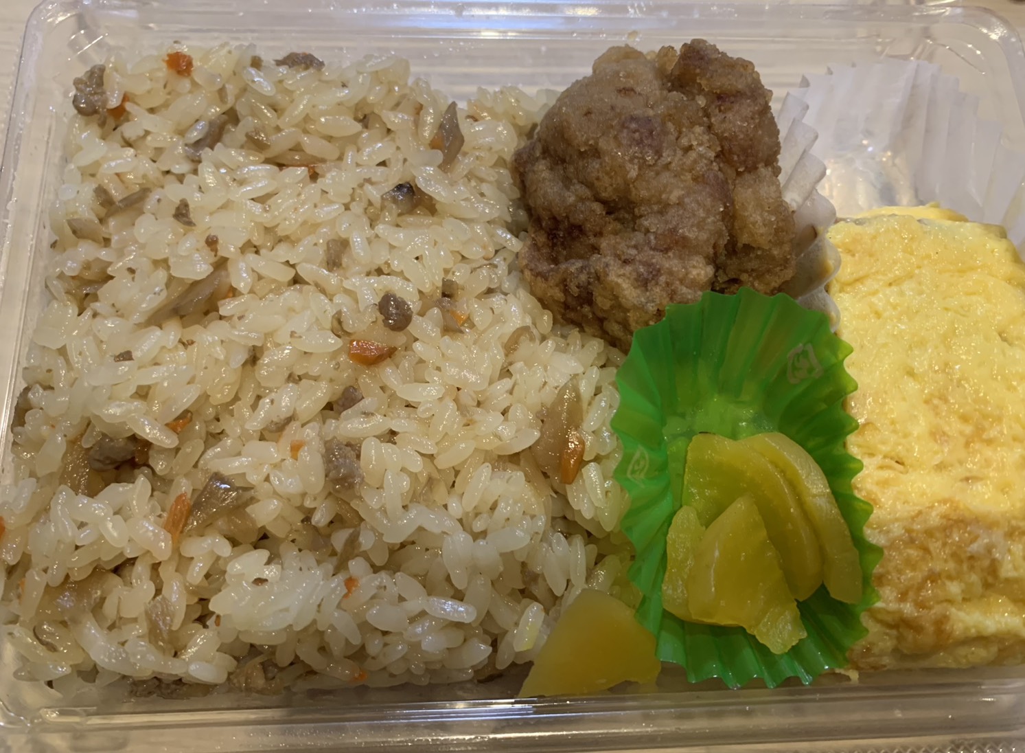 添えられた唐揚げは衣が軽く、冷めても美味しく食べられるタイプ。